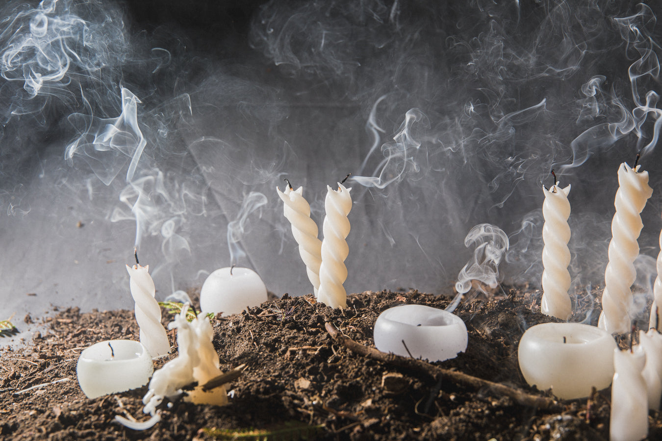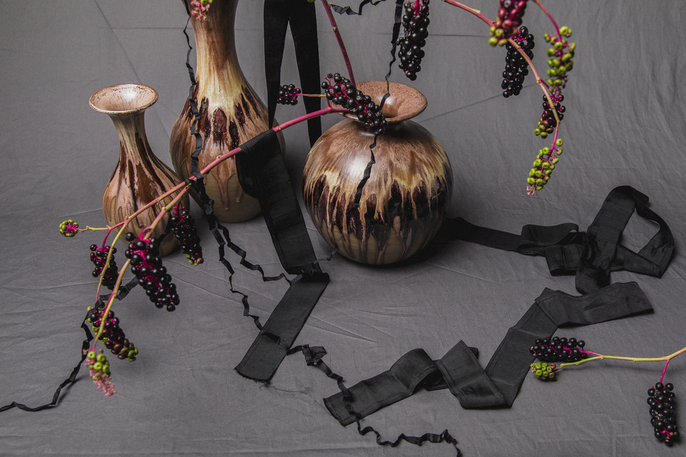 They are paired with off-white candles whose soft, living flame recalls the glow of remembrance, and handmade wreaths and plant compositions woven from Phytolacca americana, wild rose hips, and dry grasses, plants that hold both colour and silence, marking the threshold between life and rest.