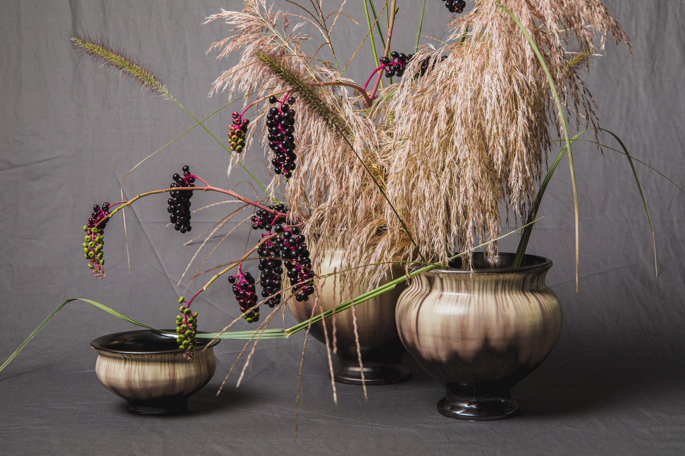 The collection includes Éva Bod’s hand-thrown ceramics: vases, bowls, and vessels glazed in flowing layers of brown, grey, and metallic earth tones, each surface echoing the patina of time and the beauty of transience.