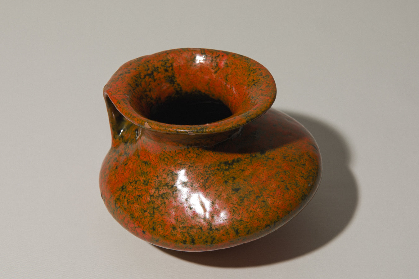A low, wide-mouthed vase with a gently tilted form, its single handle and spout-like opening giving it the character of a small pitcher. Produced at the Pesthidegkút Ceramics Factory in Hungary, it reflects the workshop’s experimentation with playful, functional silhouettes during the mid-20th century.