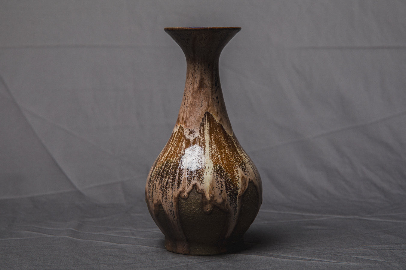 Created between the 1960s and 1980s, her vases often blend earthy tones with molten, mineral-like finishes, revealing both control and spontaneity in the firing process. Each piece carries traces of the hand and the kiln, subtle irregularities that speak to a deep engagement with material and process.