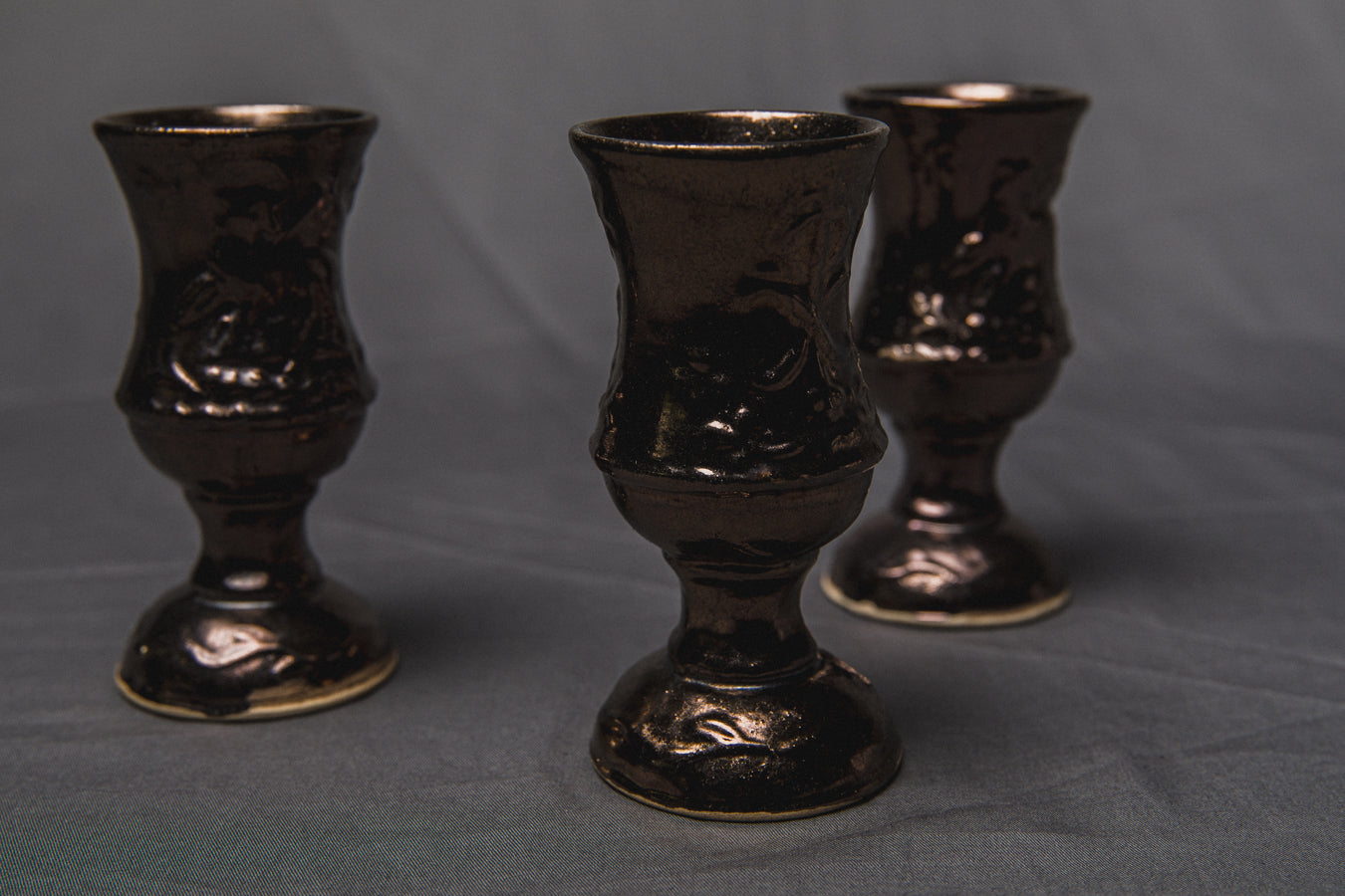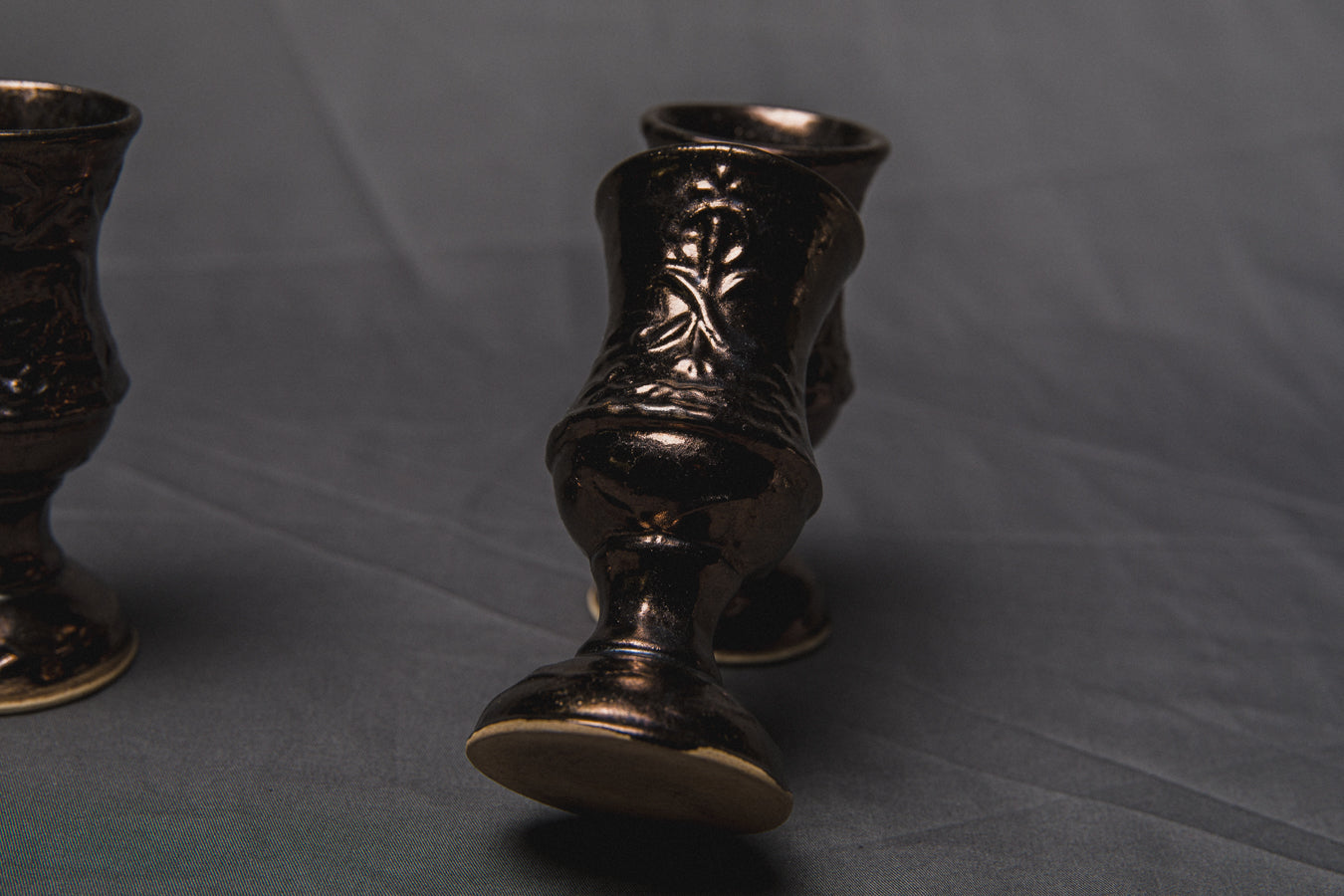 These religious-themed faience cups feature sacred motifs such as the lamb and the cross, rendered in a distinctive cast form and finished with a lustrous, metallic glaze in deep reddish-brown tones. Their glossy surface and symbolic decoration evoke the atmosphere of mid-20th-century devotional art, when faith-inspired motifs were reinterpreted through Hungarian ceramic traditions.