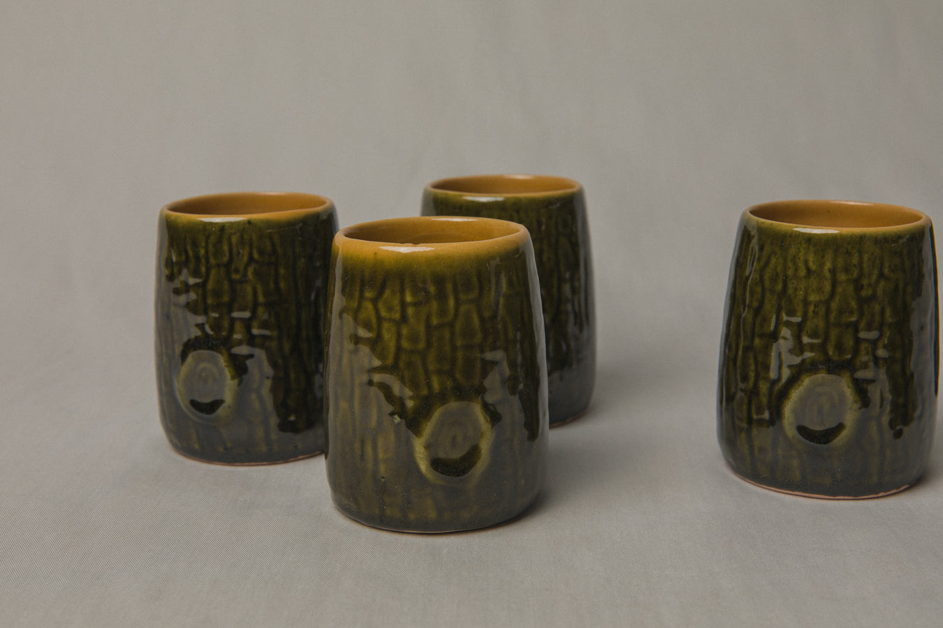 This set of faience tumblers, inspired by a traditional tree bark motif, comes from the pottery village of Magyarszombatfa, a place where craft and cultural memory are deeply interwoven. The raised tree-like texture is more than ornament, it is a tactile link to the close nature that shaped rural Hungarian life.