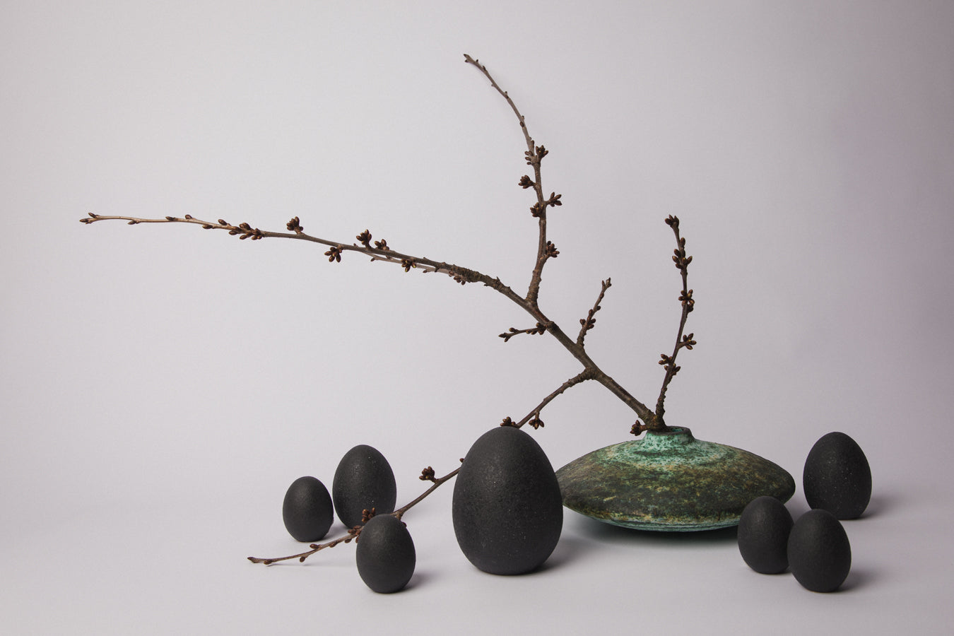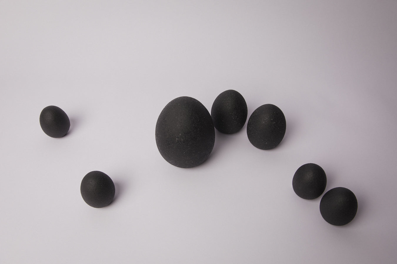 This pair of small contemporary ceramic eggs is finished in a matte, chamotte-rich glaze with a stone-like, graphite surface. The texture feels raw and mineral, evoking weathered rock.