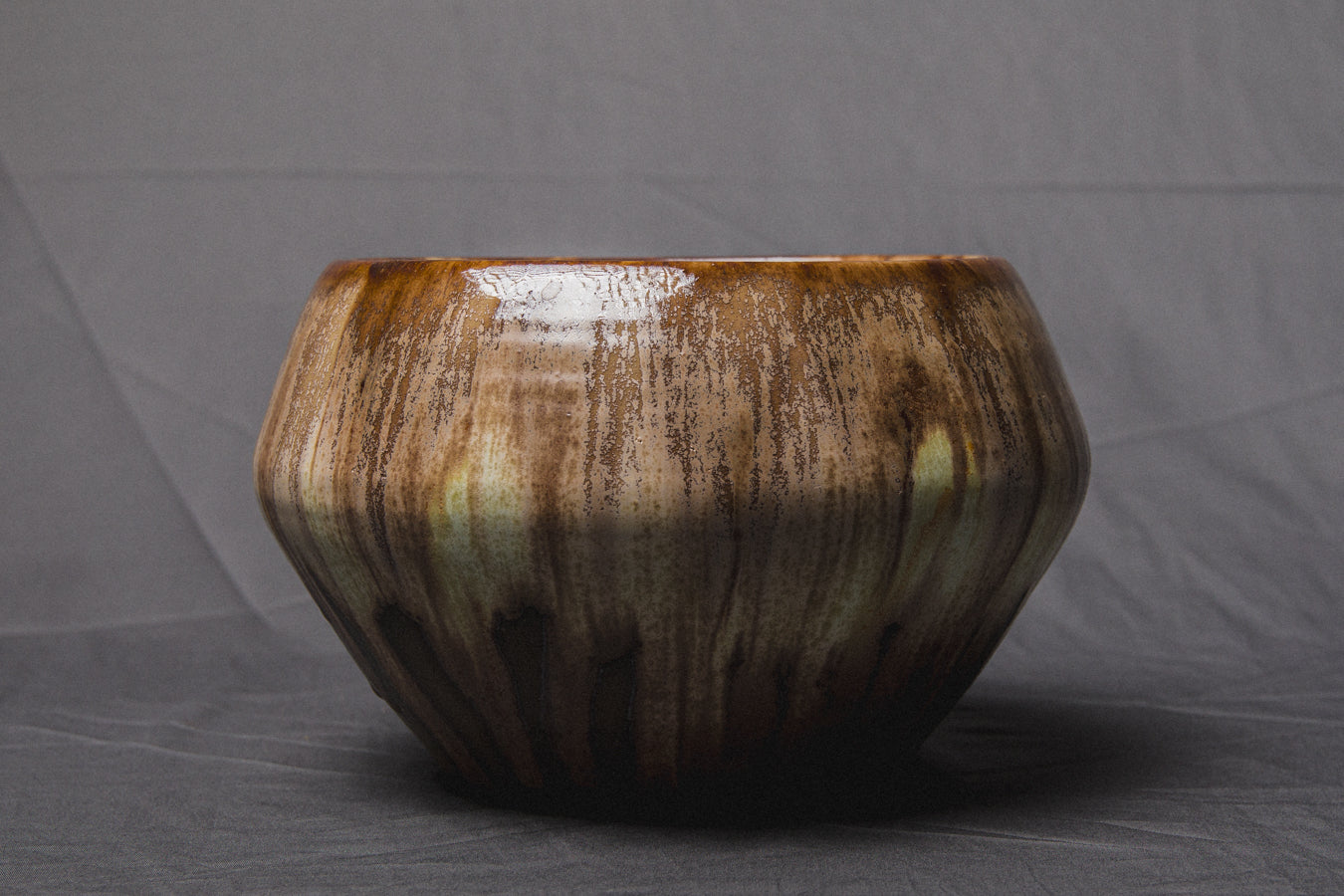 Created between the 1960s and 1980s, her pieces often blend earthy tones with molten, mineral-like finishes, revealing both control and spontaneity in the firing process. Each piece carries traces of the hand and the kiln, subtle irregularities that speak to a deep engagement with material and process.