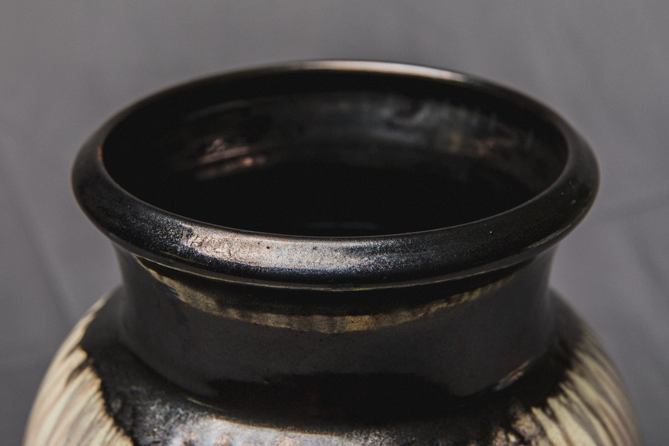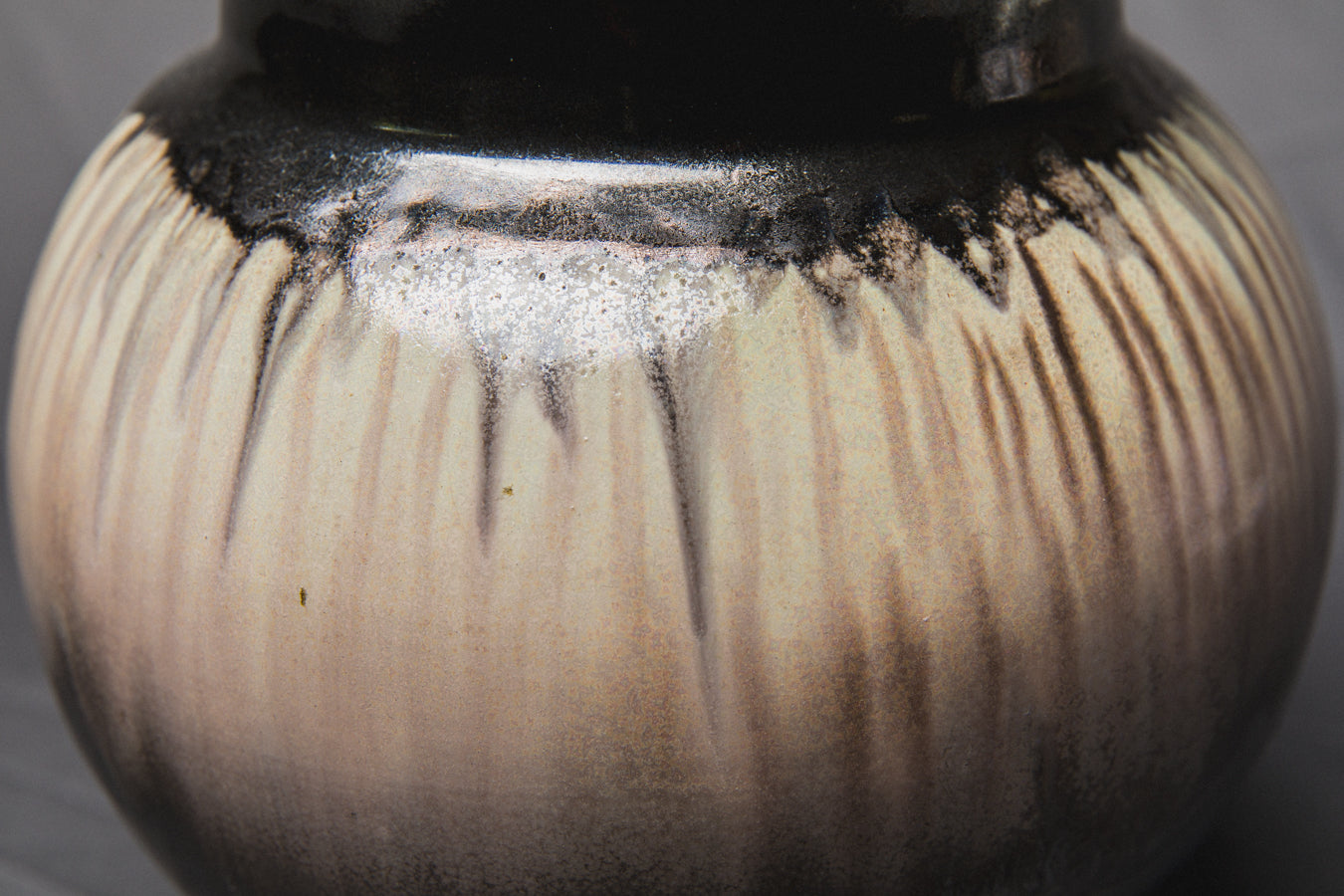 Created between the 1960s and 1980s, her vases often blend earthy tones with molten, mineral-like finishes, revealing both control and spontaneity in the firing process. Each piece carries traces of the hand and the kiln, subtle irregularities that speak to a deep engagement with material and process.