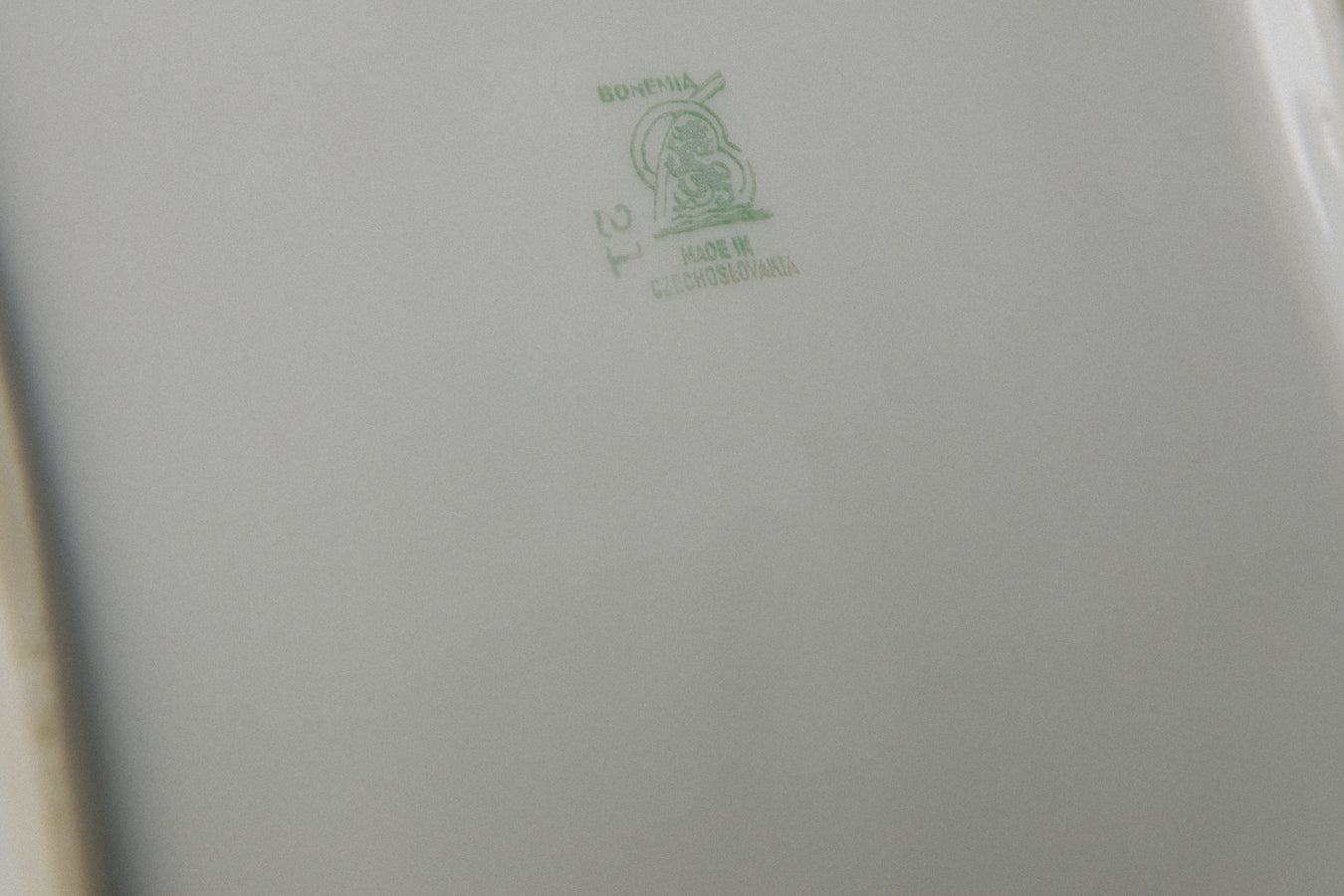 A square vintage white porcelain serving plate with gold stripe, marked Bohemia - Made in CZ. Bohemian porcelain was closely tied to Hungarian domestic life through regional trade and family connections.