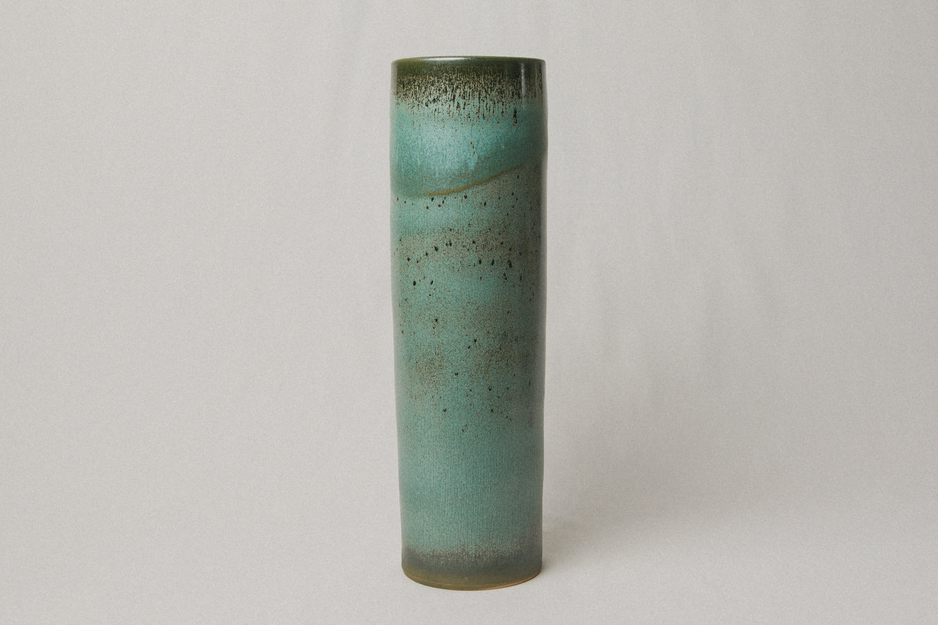 This contemporary Hungarian floor vase takes on a tall, refined silhouette - a slender cylinder-like form. Its surface is finished in layered shades of green, where deep forest tones meet softer, lighter hues, all unified by a glossy, smooth glaze that accentuates the vase’s height and clean geometry.