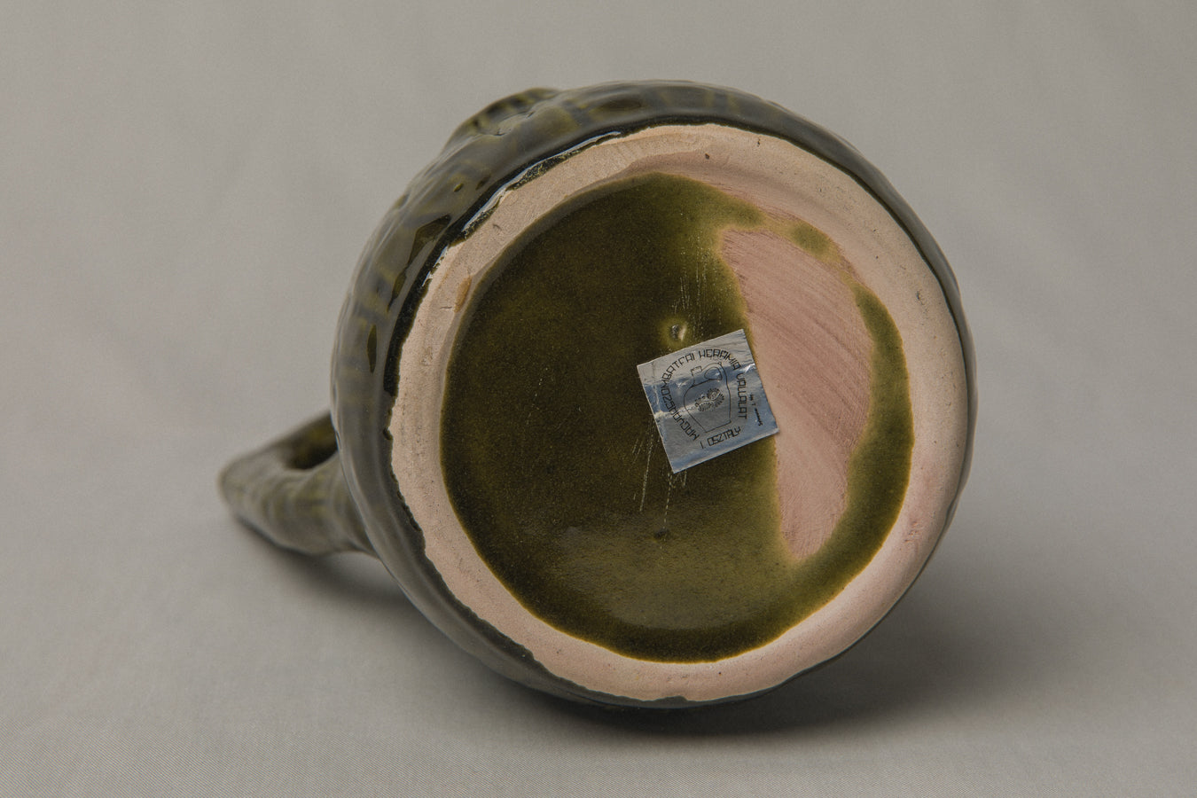 This faience pitcher, shaped like a tree bark and adorned with tree branch along its handle, reflects a deep connection to nature and rural symbolism in Hungarian craft.