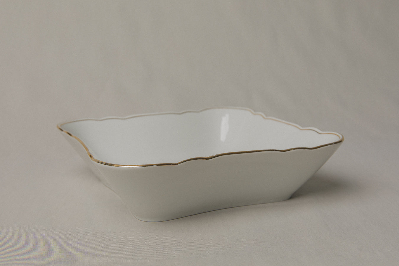 A vintage white porcelain square serving dish with gold stripe detailing, marked Bavaria Porzellan. Such serving pieces were widely available throughout Central Europe and naturally became part of Hungarian family tables.