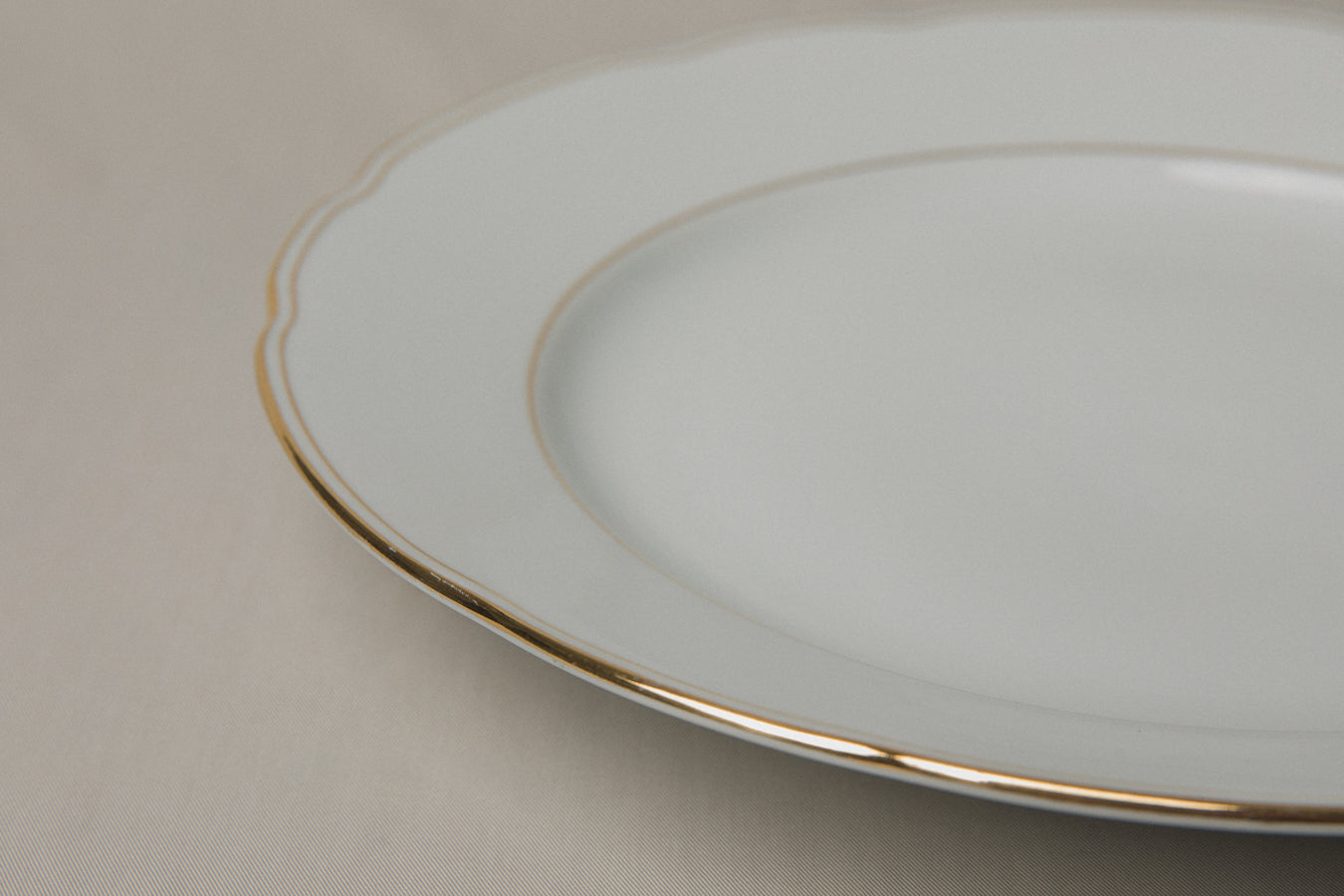 A flat round vintage white porcelain serving plate with gold stripe detailing. Simple and adaptable, it represents the everyday porcelain objects that quietly shaped Hungarian table culture.
